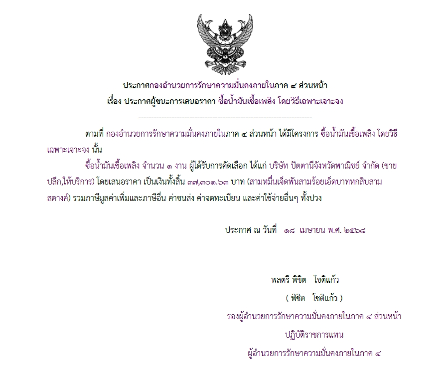 ประกาศผู้ชนะการเสนอราคา ซื้อน้ำมันเชื้อเพลิง โดยวิธีเฉพาะเจาะจง