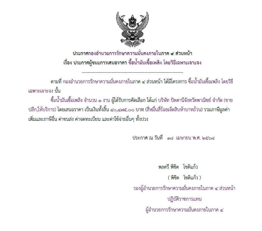 ประกาศผู้ชนะการเสนอราคา ซื้อน้ำมันเชื้อเพลิง โดยวิธีเฉพาะเจาะจง