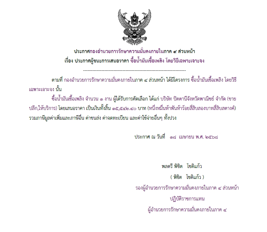 ประกาศผู้ชนะการเสนอราคา ซื้อน้ำมันเชื้อเพลิง โดยวิธีเฉพาะเจาะจง