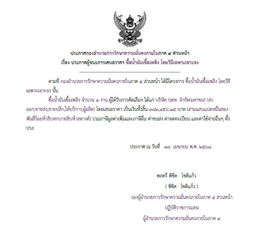 ประกาศผู้ชนะการเสนอราคา ซื้อน้ำมันเชื้อเพลิง โดยวิธีเฉพาะเจาะจง