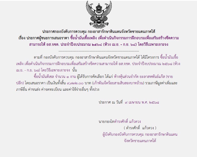 จัดซื้อ จัดจ้างประกาศผู้ชนะการเสนอราคา ประกาศผู้ชนะการเสนอราคา ซื้อน้ำมันเชื้อเพลิง เพื่อดำเนินกิจกรรมการฝึกอบรมเพื่อเสริมสร้างขีดความ สามารถให้ อส.จชต. ประจำปีงบประมาณ ๒๕๖๘ (ห้วง เม.ย. – ก.ย. ๖๘) โดยวิธีเฉพาะเจาะจง April 29, 2025 218 Share Facebook Twitter Google+ Telegram LINE