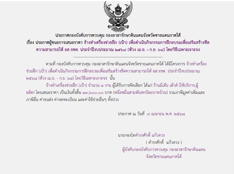 จัดซื้อ จัดจ้างประกาศผู้ชนะการเสนอราคา ประกาศผู้ชนะการเสนอราคา จ้างทำเครื่องช่วยฝึก (เป้า) เพื่อดำเนินกิจกรรมการฝึกอบรมเพื่อเสริมสร้างขีด ความสามารถให้ อส.จชต. ประจำปีงบประมาณ ๒๕๖๖๘ (ห้วง เม.ย. – ก.ย. ๖๘) โดยวิธีเฉพาะเจาะจง April 29, 2025 177 Share Facebook Twitter Google+ Telegram LINE