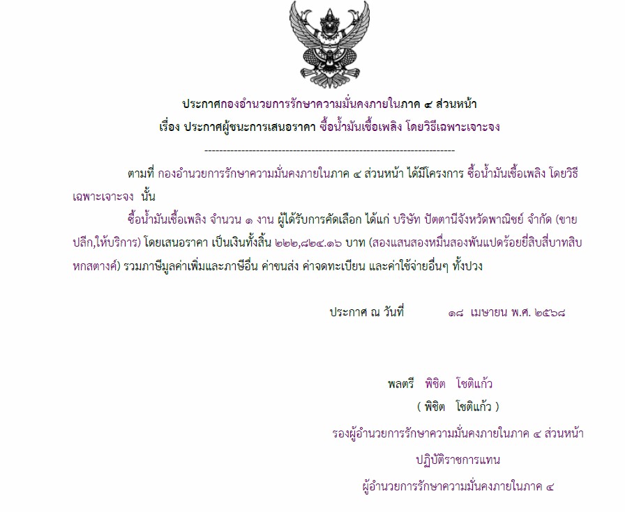 ประกาศผู้ชนะการเสนอราคา ซื้อน้ำมันเชื้อเพลิง โดยวิธีเฉพาะเจาะจง