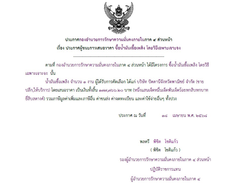 ประกาศผู้ชนะการเสนอราคา ซื้อน้ำมันเชื้อเพลิง โดยวิธีเฉพาะเจาะจง