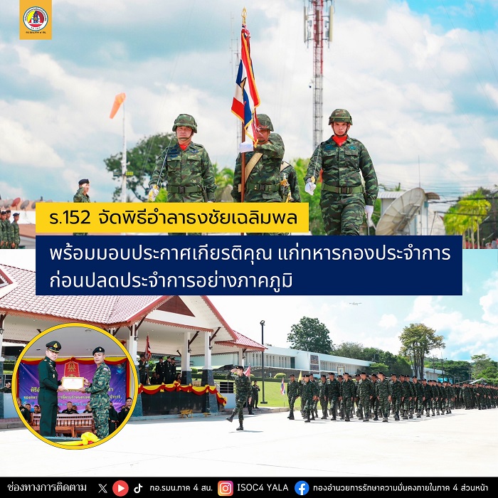 วันนี้ (30 เมษายน 2568) เวลา 09.00 น. ที่ศาลาพินประเสริฐ ค่ายสิรินธร ตำบลเขาตูม อำเภอยะรัง จังหวัดปัตตานี พันเอก สิทธิศักดิ์ เจนบรรจง ผู้บังคับการกรมทหารราบที่ 152 เป็นประธานพิธีอำลาธงชัยเฉลิมพล ของทหารกองประจำการ ซึ่งปลดประจำการเป็นทหารกองหนุน จากหน่วยขึ้นตรงกรมทหารราบที่ 152 ทั้งหมด 3 กองพัน คือ กองพันทหารราบที่ 1 กรมทหารราบที่ 152, กองพันทหารราบที่ 2 กรมทหารราบที่ 152 และ กองพันทหารราบที่ 3 กรมทหารราบที่ 152 ในการนี้ หนึ่งในผู้ที่ได้รับมอบเกียรติบัตรและเกียรติคุณดีเด่น ได้กล่าวถึงความภาคภูมิใจ และจะนำความรู้จากกองทัพไปพัฒนาต่อยอดสู่การเป็นทหารอาชีพ คือ การปฏิบัติตนเป็นพลเมืองที่ดีและพร้อมช่วยเหลือประชาชนในทุกโอกาส พร้อมย้ำว่ามีใจรักและใฝ่ฝันอยากรับราชการทหาร และฝากความห่วงใยถึงรุ่นน้องทุกคนที่จะเข้ามาประจำการว่า “กองทัพจะดูแล พร้อมมอบความรู้ให้คุณเปรียบเสมือนครอบครัวเดียวกัน” ผู้บังคับบัญชาทุกระดับพร้อมส่งเสริม ต่อยอดในการประกอบอาชีพหลังปลดประจำการ