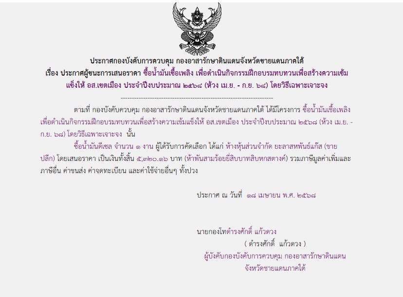 จัดซื้อ จัดจ้างประกาศผู้ชนะการเสนอราคา ประกาศผู้ชนะการเสนอราคา ซื้อน้ำมันเชื้อเพลิง เพื่อดำเนินกิจกรรมฝีกอบรมทบทวนเพื่อสร้างความเข้ม แข็งให้ อส.เขตเมือง ประจำปีงบประมาณ ๒๕๖๘ (ห้วง เม.ย. – ก.ย. ๖๘) โดยวิธีเฉพาะเจาะจง April 30, 2025 194 Share Facebook Twitter Google+ Telegram LINE