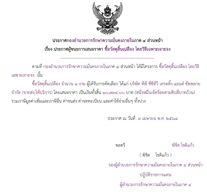 ประกาศผู้ชนะการเสนอราคา ซื้อวัสดุสิ้นเปลือง โดยวิธีเฉพาะเจาะจง