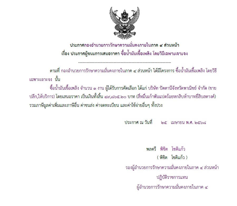 ประกาคผู้ชนะการเสนอราคา ซื้อน้ำมันเชื้อเพลิง โดยวิธีเฉพาะเจาะจง