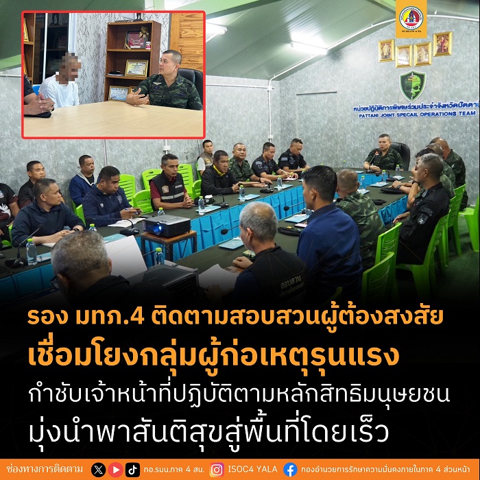 ต่อมาเวลา 09.00 น. พลตรี วรเดช เดชรักษา รองแม่ทัพภาคที่ 4 / รองผู้อำนวยการรักษาความมั่นคงภายในภาค 4 ส่วนหน้า เข้าติดตามการปฏิบัติงาน และสอบถามปัญหาข้อขัดข้องของหน่วยของข่าวกรองทางทหาร ส่วนหน้าจังหวัดชายแดนภาคใต้ (ขกท.สน.จชต.) ตำบลบ่อทอง อำเภอหนองจิก จังหวัดปัตตานี พร้อมเข้าพบปะกับญาติบุคคลต้องสงสัย อาจจะเป็นผู้ร่วมก่อเหตุสร้างสถานการณ์ในพื้นที่จังหวัดชายแดนภาคใต้ เพื่อสร้างความเข้าใจที่ถูกต้อง ต่อการดำเนินการตามกฏหมายของทางราชการ และการปฎิบัติงานของเจ้าหน้าที่รัฐ ภายใต้กองอำนวยการรักษาความมั่นคงภายในภาค 4 ส่วนหน้า ในการปฏิบัติการตรวจค้น การกักตัวบุคคลต้องสงสัยตาม พ.ร.บ.กฎอัยการศึก พ.ศ.2457 และระเบียบกองอำนวยการรักษาความมั่นคงภายในภาค 4 ส่วนหน้า ว่าด้วยวิธีการปฏิบัติงานของเจ้าหน้าที่ตามมาตรา 11 แห่งพระราชกำหนดการบริหารราชการในสถานการณ์ฉุกเฉิน พ.ศ.2548 ย้ำทุกขั้นตอน ยึดหลักสิทธิมนุษยชนเคร่งครัดหลังยกระดับการรักษาความปลอดภัยพื้นที่จังหวัดชายแดนภาคใต้