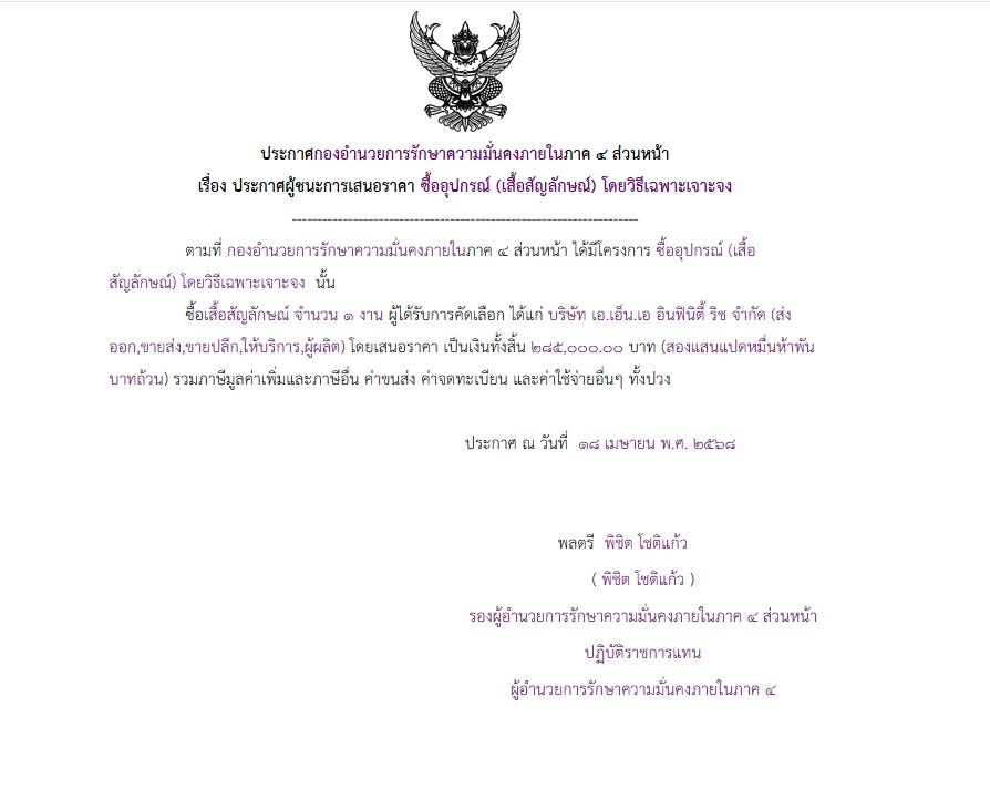 ประกาศผู้ชนะการเสนอราคา ซื้ออุปกรณ์ (เสื้อสัญลักษณ์) โดยวิธีเฉพาะเจาะจง