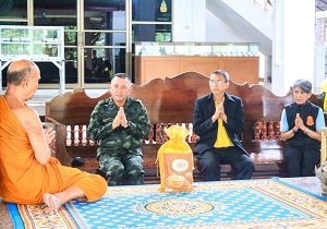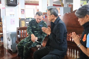 ต่อมาในเวลา 17.10 น. พลตรี ณรงค์ ตันติสิทธิพร พร้อมคณะฯ ได้เดินทางไปยังวัดพุทธาธิวาส พระอารามหลวง อ.เบตง จ.ยะลา เพื่อกราบนมัสการพระสุนทรวิสุทธานุวัตร (หลวงพ่อหวง สุมโน) เจ้าอาวาสวัดพุทธาธิวาส และได้ถวายสังฆทาน พร้อมขอพรเพื่อความเป็นสิริมงคลแก่กำลังพล นอกจากนี้ คณะฯ ยังได้เยี่ยมชมความก้าวหน้าการดำเนินงานปรับปรุงภูมิทัศน์บริเวณต้นไม้ทรงปลูก จำนวน 3 ต้น ซึ่งเป็นหนึ่งในกิจกรรมเชิงสัญลักษณ์เพื่อแสดงความจงรักภักดีและน้อมรำลึกในพระมหากรุณาธิคุณของสถาบันพระมหากษัตริย์ ที่ได้เสด็จพระราชดำเนินปฏิบัติพระราชกรณียกิจในพื้นที่ 3 จังหวัดชายแดนภาคใต้