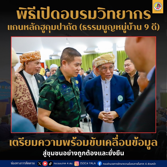 วันที่ (3 พฤษภาคม 2568) เวลา 09.30 น ณ ห้องประชุม สำนักงานคณะกรรมการอิสลามประจำจังหวัดปัตตานี ตำบลบ่อทอง อำเภอหนองจิก จังหวัดปัตตานี พลโท ไพศาล หนูสังข์ แม่ทัพภาคที่ 4 / ผู้อำนวยการรักษาความมั่นคงภายในภาค 4 ร่วมเป็นเกียรติในกิจกรรมอบรมวิทยากรแกนหลักฮูกุมปากัต (ธรรมนูญหมู่บ้าน 9 ดี) โดยมี นายแวดือราแม มะมิงจิ ประธานผู้ทรงคุณวุฒิจุฬาราชมนตรีและประธานสมาพันธ์คณะกรรมการอิสลามประจำจังหวัดชายแดนภาคใต้ เป็นประธานพิธีเปิดกิจกรรม ฯ ซึ่งมี รองเลขาธิการ กองอำนวยการรักษาความมั่นคงภายในภาค 4 ส่วนหน้า, ผู้อำนวยการศูนย์สันติวิธี, ผู้ช่วยเลขาธิการ ศูนย์อำนวยการบริหารจังหวัดชายแดนภาคใต้,หัวหน้าส่วนราชการ ซึ่งมีกลุ่มเป้าหมายผู้เข้าร่วมอบรม ประกอบด้วย ประธานชมรมโต๊ะครู ,ประธานสภาอูลามาฮฺฟาฎอนีย์ดารุสสลามมูลนิธิ และนายกสมาคมสถาบันการศึกษาปอเนาะในพื้นที่จังหวัดปัตตานี ยะลา นราธิวาส สงขลา ( อำเภอ) และสตูล รวมจำนวนทั้งสิ้น 160 ท่าน เข้าร่วม