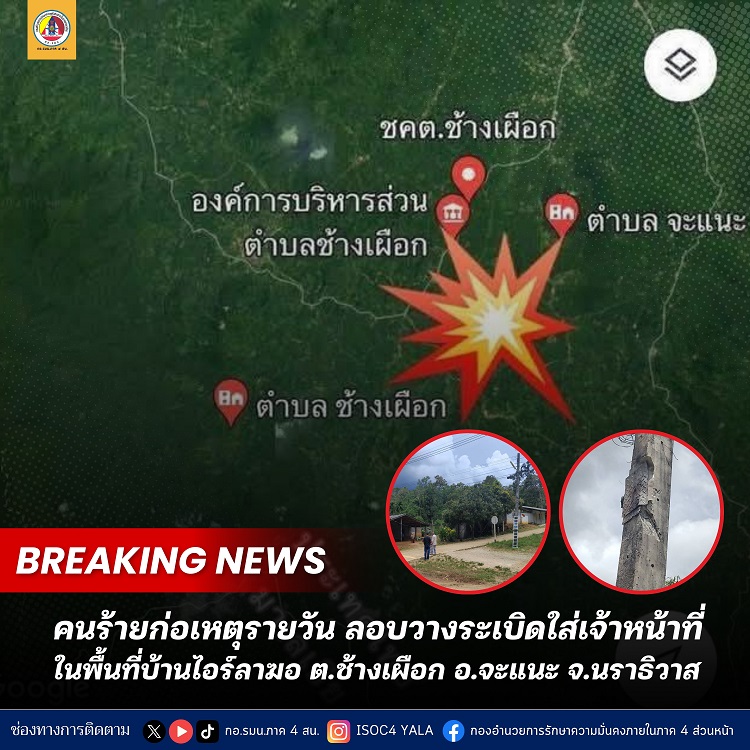 วันนี้ (4 พฤษภาคม 2568) เวลา 13.30 น. เกิดเหตุคนร้ายลอบวางระเบิดเจ้าหน้าที่ตำรวจชุดสืบสวนนราธิวาส ในพื้นที่ บ้านไอร์ลาฆอ (บ้านย้อย บ้านไอร์โซ) หมู่ที่ 5 ตำบลช้างเผือก อำเภอจะแนะ จังหวัดนราธิวาส แรงระเบิดทำให้เจ้าหน้าที่ได้รับบาดเจ็บ จำนวน 3 นาย เบื้องต้นได้นำตัวส่งโรงพยาบาลจะแนะ ทราบชื่อ คือ ดาบตำรวจ สาธิต คำแหง , สิบตำรวจโท ภคพงศ์ สุวรรณชะนะ และ สิบตำรวจโท ธีปกรณ์ ชูสิงห์ ปัจจุบันเจ้าหน้าที่ได้เข้าทำการควบคุมพื้นที่เกิดเหตุ เพื่อดำเนินการตรวจสอบ และรวบรวมวัตถุพยานหลักฐานต่าง ๆ ในพื้นที่เกิดเหตุ หากมีรายละเอียดจะรายงานให้ทราบต่อไป
