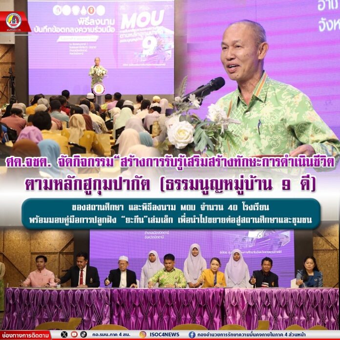 วันนี้ 6 พฤษภาคม 2568 เวลา10.00 น. ที่ ห้องพญาตานี 1 โรงแรมเซาท์เทิร์นวิว ปัตตานี อำเภอเมืองปัตตานี จังหวัดปัตตานี พลตรี กรกฎ ภู่โชติ รองผู้อำนวยการรักษาความมั่นคงภายในภาค 4 ส่วนหน้า ร่วมเป็นเกียรติและพบปะมอบโอวาทแก่ผู้เข้าร่วมกิจกรรม “สร้างการรับรู้เสริมสร้างทักษะการดำเนินชีวิต ตามหลักฮูกุมปากัต (ธรรมนูญหมู่บ้าน 9 ดี ) แลกเปลี่ยนอัตลักษณ์และวัฒนธรรมร่วมอย่างสร้างสรรค์ และพิธีลงนาม MOU ระหว่างหน่วยงานต้นสังกัด สถานศึกษาจำนวน 40 โรงเรียน ประกอบด้วย โรงเรียนในพื้นที่จังหวัดยะลา 20 โรงเรียน จังหวัดนราธิวาส 8 โรงเรียน จังหวัดปัตตานี 11 โรงเรียน และจังหวัดสงขลา 1 โรงเรียน พร้อมมอบคู่มือการปลูกฝัง “ยะกีน” เล่มเล็ก เพื่อนำไปขยายต่อทั้งในสถานศึกษาและชุมชน ซึ่งมี นายวชิรพันธ์ นาคก้อน ผู้ช่วยปลัดกระทรวงศึกษาธิการ เป็นประธานเปิดกิจกรรมฯ ผ่านวีดีโอคอล, นายนิกร เซ้งเถียร ผู้อำนวยการศูนย์ขับเคลื่อนการศึกษาในจังหวัดชายแดนภาคใต้ กล่าวรายงานฯ โดยมี ผู้แทนกองอำนวยรักษาความมั่นคงภายในภาค 4 ส่วนหน้า, ผู้แทนศูนย์อำนวยการบริหารจังหวัดชายแดนภาคใต้, ผู้นำศาสนา ตลอดจนผู้บริหารสถานศึกษา ครู คณะกรรมการสถานศึกษา ผู้นำชุมชนและนักเรียน เข้าร่วมกิจกรรมฯ