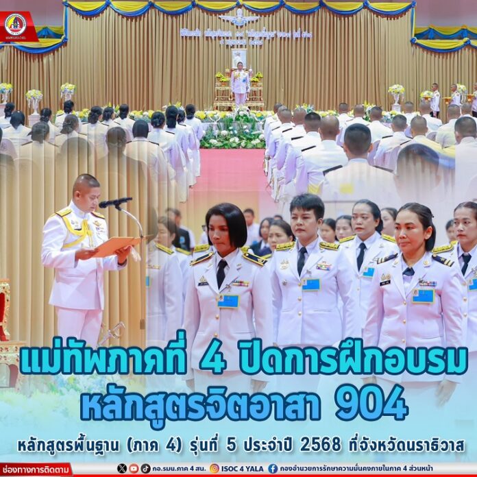 วันนี้ (8 พฤษภาคม 2568) เวลา 07.00 น. พลโท ไพศาล หนูสังข์ แม่ทัพภาคที่ 4 ในฐานะผู้อำนวยการศูนย์ฝึกจิตอาสา ภาค 4 เป็นประธานในพิธีปิดการฝึกอบรมหลักสูตรจิตอาสา 904 “หลักสูตรพื้นฐาน” (ภาค 4) รุ่นที่ 5 ประจำปี 2568 โดยมี นายวิชาญ ชัยเศรษฐสัมพันธ์ รองผู้ว่าราชการจังหวัดนราธิวาส ร่วมต้อนรับ ณ ศูนย์ฝึกจิตอาสา ภาค 4 ณ ค่ายจุฬาภรณ์ ตำบลโคกเคียน อำเภอเมืองนราธิวาส สำหรับการฝึกอบรม หลักสูตรจิตอาสา 904 “หลักสูตรพื้นฐาน” (ภาค 4) รุ่นที่ 5 ประจำปี 2568 จัดขึ้นระหว่างวันที่ 22 เมษายน ถึงวันที่ 8 พฤษภาคม 2568 รวมระยะเวลา 17 วัน โดยคัดเลือกเยาวชน และนักเรียนเข้ารับการอบรม จำนวน 87 คน และผู้ที่มีคุณสมบัติเหมาะสม จำนวน 113 คน จากข้าราชการ และประชาชน ในพื้นที่ 14 จังหวัดภาคใต้ เพื่อให้ผู้เข้ารับการฝึกอบรม สามารถเป็นแกนนำในการทำกิจกรรมสาธารณประโยชน์ ในลักษณะการเป็นจิตอาสา สร้างผู้นำที่มีความเสียสละ มีระเบียบวินัย รู้จักหน้าที่ และมีจิตสาธารณะเป็นเครือข่ายจิตอาสาเพื่อแก้ไขปัญหาความเดือดร้อนของประชาชน โดยประสานความร่วมมือกับภาครัฐ และภาคเอกชน