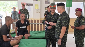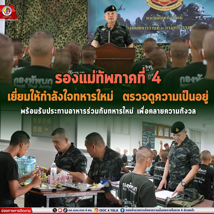 วันที่ 11 พฤษภาคม 2568 พลตรี วรเดช เดชรักษา รองแม่ทัพภาคที่ 4/ รองผู้อำนวยการรักษาความมั่นคงภายในภาค 4 ส่วนหน้า เยี่ยมหน่วยฝึกทหารใหม่ ให้กำลังใจน้องทหารใหม่ นำความห่วงใยจากผู้บังคับบัญชาสู่ทหารใหม่ผลัดที่ 1 ประจำปี 2568 เพื่อตรวจเยี่ยมดูความพร้อมของหน่วยฝึกทหารใหม่ ในพื้นที่จังหวัดยะลา ประกอบด้วย กองพันทหารราบที่ 1 กรมทหารราบที่ 152 ค่ายพยัคฆ์ อำเภอบันนังสตา, กองพันทหารราบที่ 2 กรมทหารราบที่ 152 ค่ายพระยาเดชานุชิต อำเภอรามัน และ กองพันทหารราบที่ 3 กรมทหารราบที่ 152 ค่ายสิรินธร ซึ่งในขณะนี้ทุกหน่วยฝึกทหารใหม่ อยู่ในช่วงของการปรับพื้นฐานการฝึก ปรับสภาพร่างกาย จิตใจ ของทหารใหม่ท่ามกลางสภาพอากาศร้อน โดยมี ผู้บังคับกองพัน พร้อมด้วยครูฝึกทหารใหม่ นำตรวจเยี่ยมความเป็นอยู่ของโรงนอน ระบบสุขาภิบาล โรงประกอบเลี้ยง และสถานที่ฝึกทหารใหม่ที่อย่างเหมาะสม เพื่อป้องกันการเกิดภาวะลมร้อน และป้องกันโรคระบาด โรคติดต่อทุกประเภทในระหว่างการฝึก ตามนโยบายของกองทัพบก และผู้บังคับบัญชาป้องกันไม่ให้เกิดการสูญเสียไม่ว่ากรณีใดๆ