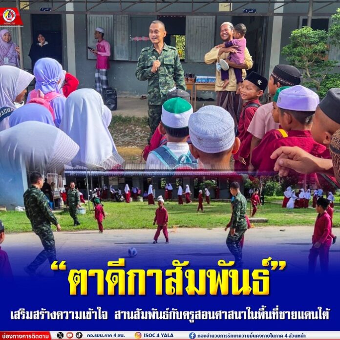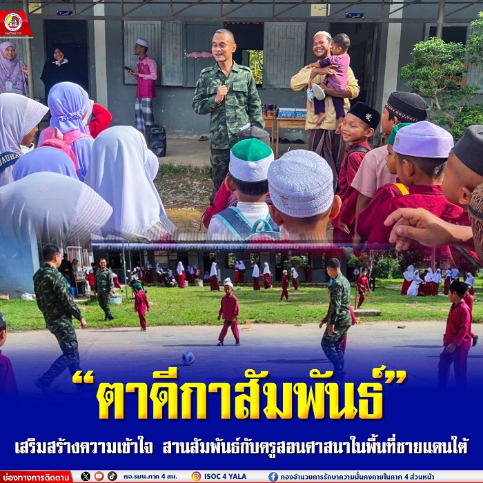 วันที่ 11 พฤษภาคม 2568 หน่วยเฉพาะกิจ กองพันทหารราบที่ 1 (ฉก.พัน.ร.ที่ 1) จัดกำลังพลชุดปฏิบัติการเสริมสร้างความเข้าใจ ลงพื้นที่โรงเรียนสอนศาสนา (ตาดีกา) ประจำมัสยิดตาดีกาดาลัมกราวะ บ้านโคกหญ้าคา หมู่ที่ 6 ตำบลคลองใหม่ อำเภอยะรัง จังหวัดปัตตานี เพื่อพบปะพูดคุยกับบุคลากรทางการศึกษาและเยาวชนในโรงเรียน ตลอดจนมีเป้าหมายเพื่อเสริมสร้างความเข้าใจ ลดความหวาดระแวง พร้อมทั้งชี้แจงมาตรการต่าง ๆ ด้านความปลอดภัยในพื้นที่รับผิดชอบของหน่วย เพื่อให้บุคลากรทางการศึกษาและประชาชนในพื้นที่รู้สึกอุ่นใจ และมีความมั่นใจในการดูแลความปลอดภัยให้กับประชาชน และได้รับข้อมูลข่าวสารที่ถูกต้อง ทันสถานการณ์