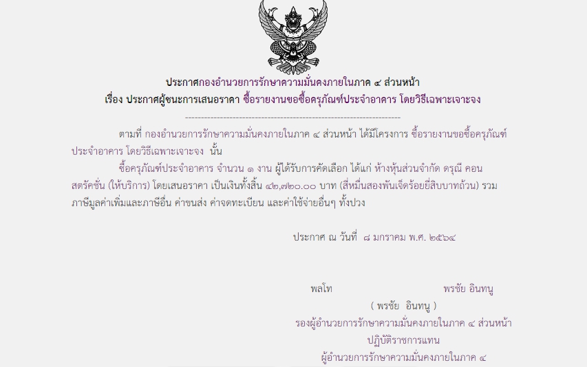 ประกาศผู้ชนะการเสนอราคา ซื้อรายงานขอซื้อครุภัณฑ์ประจำอาคาร โดยวิธีเฉพาะเจาะจง ( ๔๒,๗๒๐.๐๐ บาท )