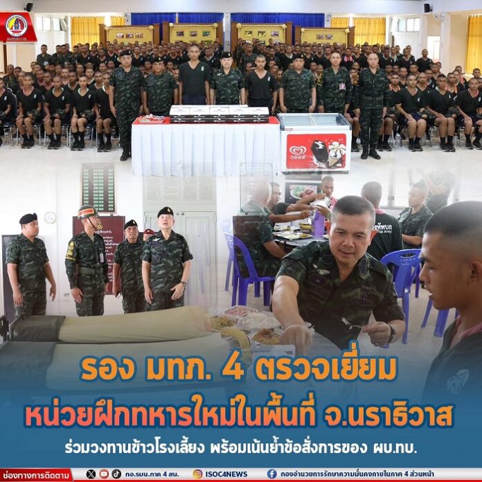 วันที่ 12 พฤษภาคม 2568 เวลา 10.00 น. พลตรี วรเดช เดชรักษา รองแม่ทัพภาคที่ 4/ รองผู้อำนวยการรักษาความมั่นคงภายในภาค 4 ส่วนหน้า เยี่ยมให้กำลังใจ น้องทหารใหม่ ผลัดที่ 1 ประจำปี 2568 เพื่อตรวจเยี่ยมดูแลความเป็นอยู่ของทหารใหม่ และความพร้อมของหน่วยฝึกทหารใหม่ ประกอบด้วย กองพันทหารราบที่ 1 กรมทหารราบที่ 151, กองพันทหารราบที่ 2 กรมทหารราบที่ 151 ค่ายกัลยาณิวัฒนา ตำบลกะลุวอ อำเภอเมืองนราธิวาส จังหวัดนราธิวาส, และ กองพันทหารราบที่ 3 กรมทหารราบที่ 151 ค่ายกรมหลวงนราธิวาสราชนครินทร์ ตำบล มะรือโบออก อำเภอเจาะไอร้อง จังหวัดนราธิวาส เพื่อกำชับเน้นย้ำให้หน่วยฝึกทหารใหม่ปฏิบัติตามมาตรฐานการฝึกตามนโยบายของผู้บัญชาการทหารบก และกรมยุทธศึกษาทหารบกกำหนดไว้อย่างเคร่งครัด พร้อมร่วมวงรับประทานอาหารกลางวันกับทหารใหม่ ขัดฉาก กล่าวคำปฏิญาณ ก่อนรับประทานอาหาร ด้วยบรรยากาศที่เป็นกันเอง สร้างความประทับใจแก่น้องๆ ทหารใหม่