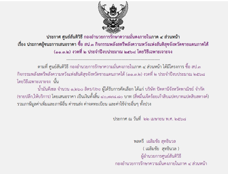 จัดซื้อ จัดจ้างประกาศผู้ชนะการเสนอราคา ประกาศผู้ชนะการเสนอราคา ซื้อ สป.๓ กิจกรรมพลังสตรีพลังความหวังแห่งสันติสุขจังหวัดชายแดนใต้(๑๑.๓.๒) งวดที่ ๒ ประจำปีงบประมาณ ๒๕๖๘ โดยวิธีเฉพาะเจาะจง May 13, 2025 183 Share Facebook Twitter Google+ Telegram LINE