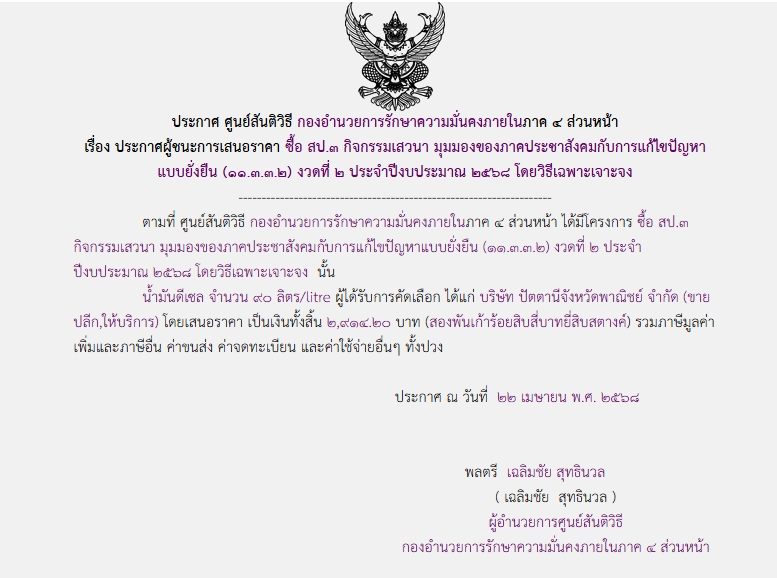 จัดซื้อ จัดจ้างประกาศผู้ชนะการเสนอราคา ประกาศผู้ชนะการเสนอราคา ซื้อ สป.๓ กิจกรรมเสวนา มุมมองของภาคประชาสังคมกับการแก้ปัญหาแบบยั่งยืน (๑๑.๓.๓.๒) งวดที่ ๒ ประจำปีงบประมาณ ๒๕๖๘ โดยวิธีเฉพาะเจาะจง May 13, 2025 185 Share Facebook Twitter Google+ Telegram LINE