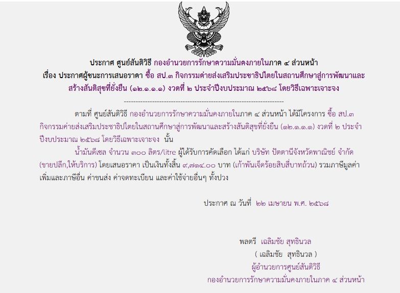 จัดซื้อ จัดจ้างประกาศผู้ชนะการเสนอราคา ประกาศผู้ชนะการเสนอราคา ซื้อ สป.๓ กิจกรรมค่ายส่งเสริมประชาธิปไตรในสถานศึกษาสู่การพัฒนาและสร้างสันติสุขที่ยั่งยืน (๑๒.๑.๑.๑) งวดที่ ๒ ประจำปีงบประมาณ ๒๕๖๘ โดยวิธีเฉพาะเจาะจง May 13, 2025 188 Share Facebook Twitter Google+ Telegram LINE