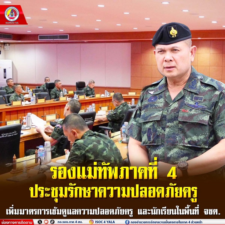 วันนี้ (13 พฤษภาคม 2568) เวลา 13.00 น. ที่ห้องประชุม 1 กอ.รมน.ภาค 4 สน. ค่ายสิรินธร ตำบลเขาตูม อำเภอยะรัง จังหวัดปัตตานี พลตรี วรเดช เดชรักษา รองแม่ทัพภาคที่ 4/ รองผู้อำนวยการรักษาความมั่นคงภายในภาค 4 ส่วนหน้า เป็นประธานการประชุมรักษาความปลอดภัยครู และบุคลากรทางการศึกษาในพื้นที่จังหวัดชายแดนภาคใต้ ซึ่งในวันที่ 16 พฤษภาคม 2568 ที่กำลังจะถึงนี้ สถานศึกษา โรงเรียน รวมทั้งสถาบันการศึกษาต่างๆทั่วประเทศ จะเริ่มเปิดการเรียนการสอน โดยเฉพาะในพื้นที่จังหวัดชายแดนภาคใต้ซึ่งมีสถานศึกษากว่าหนึ่งพันแห่ง อีกทั้งครูและบุคลากรทางการศึกษาเป็นอีกหนึ่งกลุ่มเสี่ยงและเป็นเป้าหมายที่อาจได้รับผลกระทบจากการก่อเหตุความรุนแรงของกลุ่มผู้ก่อเหตุรุนแรงในพื้นที่จังหวัดชายแดนภาคใต้