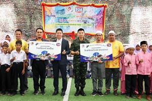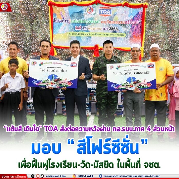 วันนี้ (14 พฤษภาคม 2568) เวลา 10.00 น. ที่ สนามฟุตซอลนาควานิช ค่ายสิรินธร ตำบลเขาตูม อำเภอยะรัง จังหวัดปัตตานี พลโท ไพศาล หนูสังข์ แม่ทัพภาคที่ 4 / ผู้อำนวยการรักษาความมั่นคงภายในภาค 4 มอบหมายให้ พลตรี ธีระ ศรีพงษ์ รองผู้อำนวยการศูนย์สันติวิธี กองอำนวยการรักษาความมั่นคงภายในภาค 4 ส่วนหน้า เป็นประธานในพิธีเปิดโครงการ “แต้มสีสร้างสรรค์ พหุวัฒนธรรมสร้างสุข” พร้อมกันนี้ได้ให้การต้อนรับ นายดิเรก มั่นคง รองผู้อำนวยการฝ่ายขาย ภาคใต้ และ ภาคกลาง ผู้แทนผู้บริหารจาก บริษัท ทีโอเอเพ้นท์ (ประเทศไทย) จำกัด (มหาชน) ซึ่งได้ให้การสนับสนุนสีทาภายในและสีทาภายนอก มูลค่ากว่า 700,000 บาท (เจ็ดแสดบาทถ้วน) เพื่อนำไปมอบให้กับโรงเรียน วัด และมัสยิดในพื้นที่จังหวัดชายแดนภาคใต้ ที่ได้รับผลกระทบจากเหตุอุทกภัยเมื่อปลายปี 2567 ที่ผ่านมา ซึ่งการสนับสนุนในครั้งนี้ มีวัตถุประสงค์เพื่อร่วมฟื้นฟูสภาพแวดล้อมและอาคารสถานที่ต่าง ๆ ที่ได้รับความเสียหาย ให้กลับมาสวยงามเช่นเดิม สะท้อนถึงความมุ่งมั่นของ TOA ในการร่วมเคียงข้างและสนับสนุนชุมชนในพื้นที่อย่างต่อเนื่อง โดยมี ผู้แทนหน่วยเฉพาะกิจในพื้นที่, สมาชิกกองอาสารักษาดินแดน, ผู้นำท้องที่ ผู้ท้องถิ่น, ผู้นำศาสนา, ผู้บริหารสถานศึกษา, คณะครูและนักเรียน ร่วมในพิธีด้วยความอบอุ่น