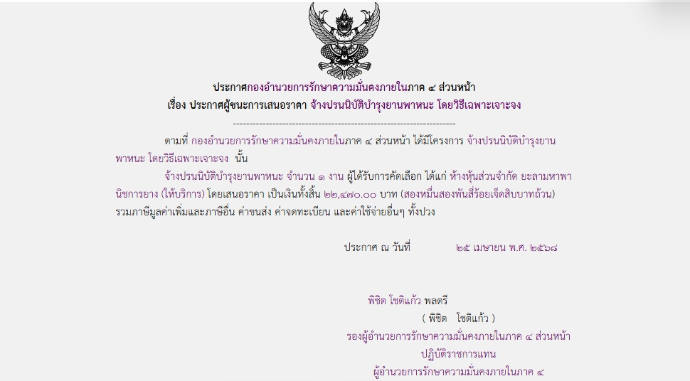 จัดซื้อ จัดจ้างประกาศผู้ชนะการเสนอราคา ประกาศผู้ชนะการเสนอราคา จ้างปรนนิบัติบำรุงยานพาหนะ โดยวิธีเฉพาะเจาะจง May 14, 2025 143 Share Facebook Twitter Google+ Telegram LINE