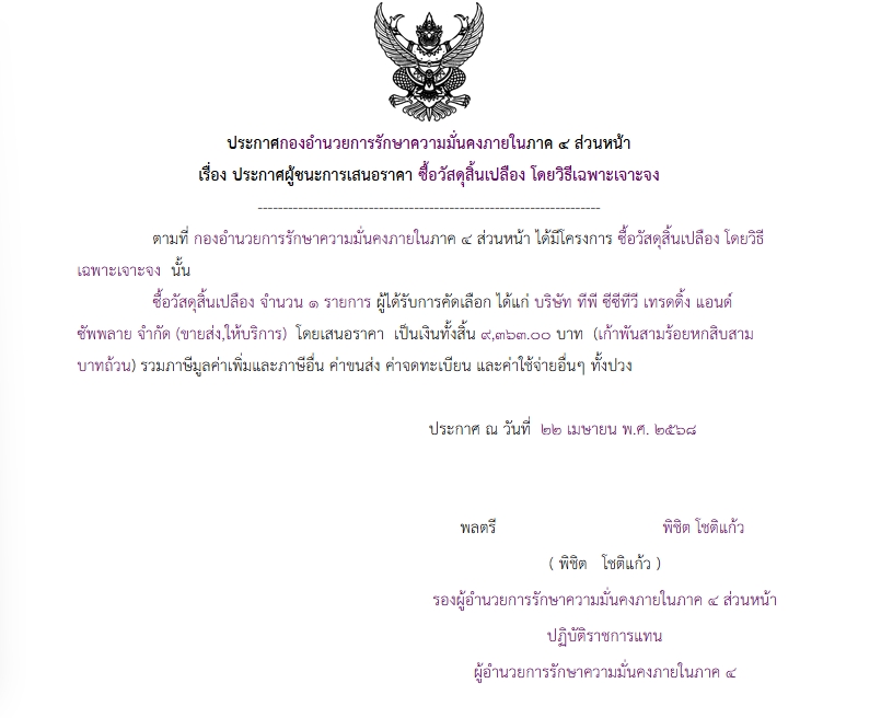 ประกาศผู้ชนะการเสนอราคา ซื้อวัสดุสิ้นเปลือง โดยวิธีเฉพาะเจาะจง