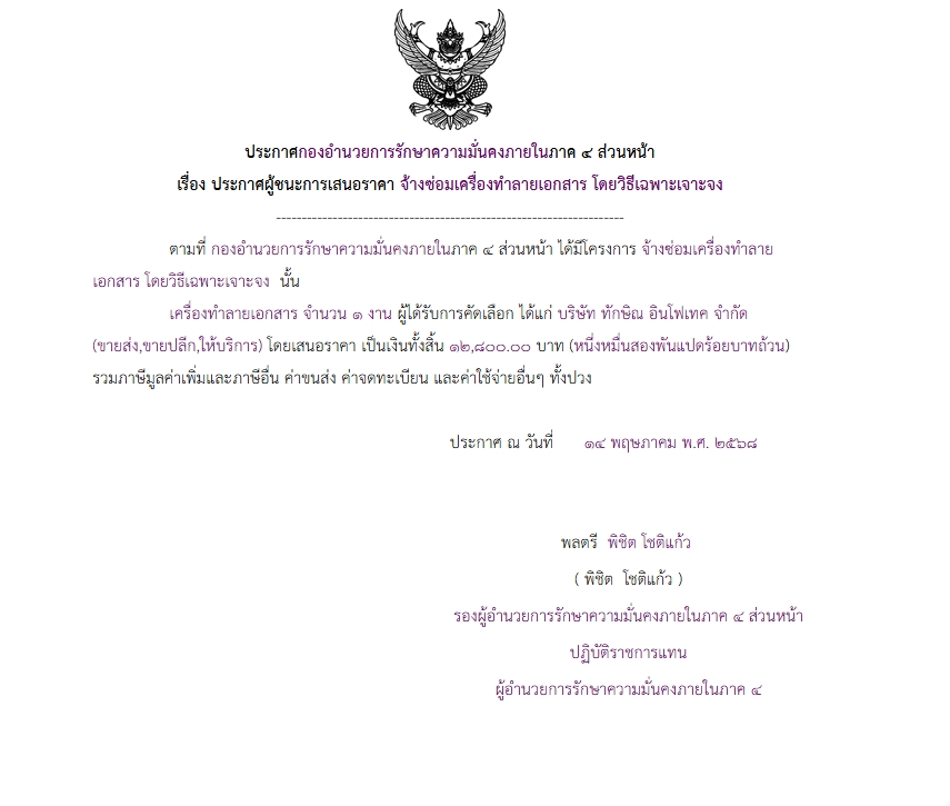 ประกาศผู้ชนะการเสนอราคา จ้างซ่อมเครื่องทำลายเอกสาร โดยวิธีเฉพาะเจาะจง