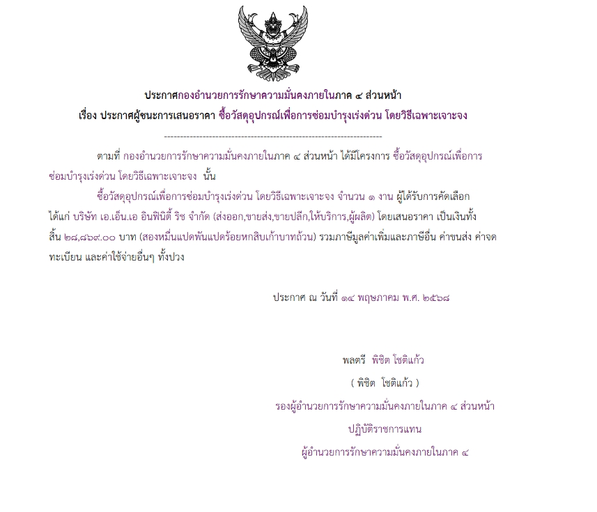 ประกาศผู้ชนะการเสนอราคา ซื้อวัสดุอุปกรณ์เพื่อการซ่อมบำรุงเร่งด่วน โดยวิธีเฉพาะเจาะจง