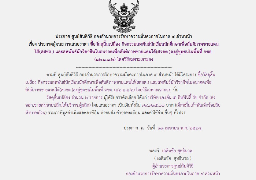 จัดซื้อ จัดจ้างประกาศผู้ชนะการเสนอราคา ประกาศผู้ชนะการเสนอราคา ซื้อวัสดุสิ้นเปลือง กิจกรรมสหพันธ์นักเรียนนักศึกษาเพื่อสันติภาพชายแดน ใต้(สสชต.) และสหพันธ์นักวิชาชีพในอนาคตเพื่อสันติภาพชายแดนใต้(สวชต.)ลงสู่ชุมชนในพื้นที่ จชต. (๑๒.๑.๑.๒) โดยวิธีเฉพาะเจาะจง May 18, 2025 147 Share Facebook Twitter Google+ Telegram LINE