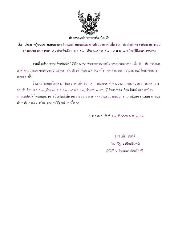 จัดซื้อ จัดจ้างประกาศผู้ชนะการเสนอราคา ประกาศผู้ชนะการเสนอราคาจ้างเหมา รดส.ปรับอากาศขนาดใหญ่ ของหน่วย ฉก.สงขลา ๔๐ ประจำเดือน ธ.ค.๖๓ (ห้วง ๒๔ ธ.ค.๖๓-๔ ม.ค.๖๔)(๑๐๐,๐๐๐บาท) January 12, 2021 1017 Share Facebook Twitter Google+ Telegram LINE ฉก.อโณทัย