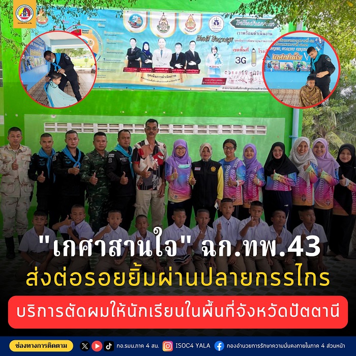 Pada 19 Mei 2025, jam 09.00 pagi, Pasukan Petugas Khas Rejimen Askar Renjer 43 telah menghantar anggota dari Kompeni 4313 dan 4314 bagi menjalankan program khidmat masyarakat, memberikan perkhidmatan gunting rambut secara percuma kepada para pelajar di kawasan tanggungjawab mereka. Program ini dinamakan “Gesa San Jai” dan telah dilaksanakan di Sekolah Bang Rapa, Kampung Bang Rapa, Mukim Tha Kam Cham, Daerah Nong Chik, serta Sekolah Ban Khlong Chang, Kampung Khlong Chang, Mukim Na Ket, Daerah Khok Pho, di Wilayah Pattani. Program ini bertujuan untuk meringankan beban kewangan ibu bapa sempena pembukaan sesi persekolahan serta mengeratkan hubungan baik antara tentera dan masyarakat melalui aktiviti yang menyentuh keperluan harian, terutamanya di kawasan yang masih kekurangan sumber asas.