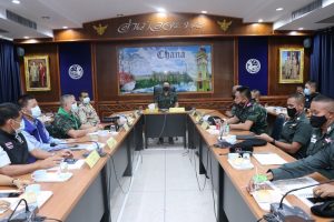 จากนั้นได้เดินทางไปประชุมการบรูณาการการปฏิบัติตามแผนรักษาความปลอดภัยในพื้นที่เขตเทศบาลตำบลบ้านนา อำเภอจะนะ จังหวัดสงขลา โดยเน้นย้ำแผนการรักษาความปลอดภัยในเขตพื้นที่รับผิดชอบของหน่วยเฉพาะกิจสงขลา ด้วยการผนึกกำลังทุกภาคส่วน ประสานการทำงานร่วม 3 ฝ่าย ทั้งทหาร ตำรวจ และฝ่ายปกครอง ภายหลังการประชุมผู้บังคับหน่วยเฉพาะกิจสงขลาได้ลงพื้นที่ตรวจเยี่ยมให้กำลังใจการปฏิบัติงานของกำลัง 3 ฝ่าย ในเขตเทศบาลเมืองจะนะ โดยได้ชื่นชมการปฏิบัติงาน และให้ทุกฝ่ายประสานความร่วมมือกันเพื่อรักษาความปลอดภัยในชีวิต และทรัพย์สินของพี่น้องประชาชน ทั้งนี้ ผู้บังคับหน่วยเฉพาะกิจสงขลา ได้เดินตลาดพบปะเยี่ยมเยียนให้กำลังใจผู้ประกอบการร้านค้า และประชาชน โดยได้พูดคุยสร้างความเข้าใจสร้างความตระหนักในมาตรการป้องกันการแพร่ระบาดของเชื้อไวรัสโควิด 19 พร้อมมอบหน้ากากอนามัย และเจลแอลกอฮอล์ให้แก่ประชาชนในพื้นที่ พร้อมกันนี้ได้ลงพื้นที่เยี่ยมการปฏิบัติงานกล้อง CCTV ณ ตำรวจภูธรจะนะ ตลอดจนจุดตรวจ/จุดสกัด หน้าวัดโรจนาราม ,แยกชวาทอง และจุดตรวจทางพาดรถไฟ อำเภอจะนะ จังหวัดสงขลา ตามแผนรักษาความปลอดภัยพื้นที่เขตเทศบาล และมอบนโยบายการปฏิบัติงานของ ผู้อำนวยการรักษาความมั่นคงภายในภาค 4 พร้อมรับฟังปัญหาข้อขัดข้อง และมอบสิ่งของเพื่อเป็นขวัญกำลังใจแก่เจ้าหน้าที่