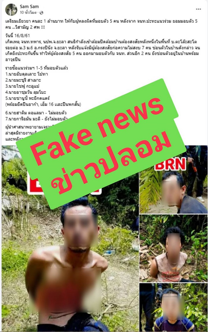 According to a post on a Facebook page named Sam Sam, on August 16, 2018, authorities surrounded a target and engaged in a clash with a group of suspects. Five individuals surrendered, and two others died in the incident. However, the message being distorted and spread on social media claiming that the five who surrendered would each receive 1 million baht in compensation is not true and may cause widespread misunderstanding.
