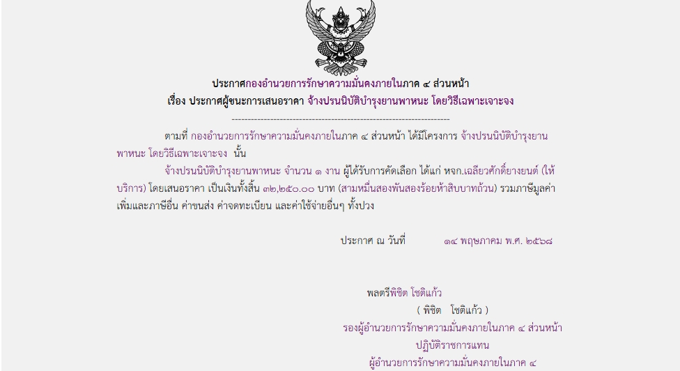 ประกาศผู้ชนะการเสนอราคา จ้างปรนนิบัติบำรุงยานพาหนะ โดยวิธีเฉพาะเจาะจง