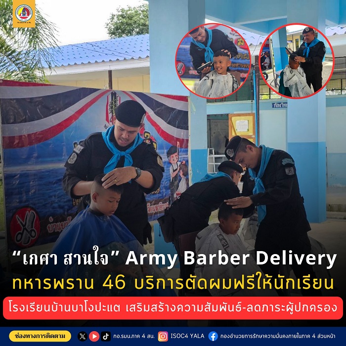วันที่ 23 พฤษภาคม 2568 เวลา 09.00 น. พันเอกสิทธิชัย บำรุงเขต ผู้บังคับหน่วยเฉพาะกิจทหารพรานที่ 46 มอบหมายให้ ร้อยเอกชัชชัย คงประจักษ์ ผู้บังคับกองร้อยทหารพรานที่ 4609 นำกำลังชุดประชาสัมพันธ์ของหน่วย ออกให้บริการตัดผมฟรีแก่เยาวชนนักเรียน ณ โรงเรียนบ้านบาโงปะแต หมู่ 1 ตำบลโคกสะตอ อำเภอรือเสาะ จังหวัดนราธิวาส มีนักเรียนเข้ารับบริการตัดผมฟรีจำนวนทั้งสิ้น 34 คน