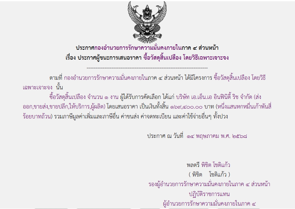ประกาศผู้ชนะการเสนอราคา ขี้อวัสดุสิ้นเปลือง โดยวิธีเฉพาะเจาะจง