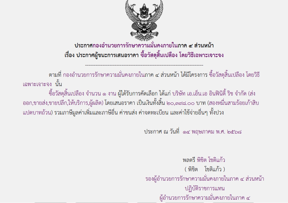 ประกาศผู้ชนะการเสนอราคา ขี้อวัสดุสิ้นเปลือง โดยวิธีเฉพาะเจาะจง