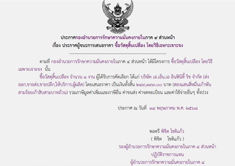 ประกาศผู้ชนะการเสนอราคา ขี้อวัสดุสิ้นเปลือง โดยวิธีเฉพาะเจาะจง