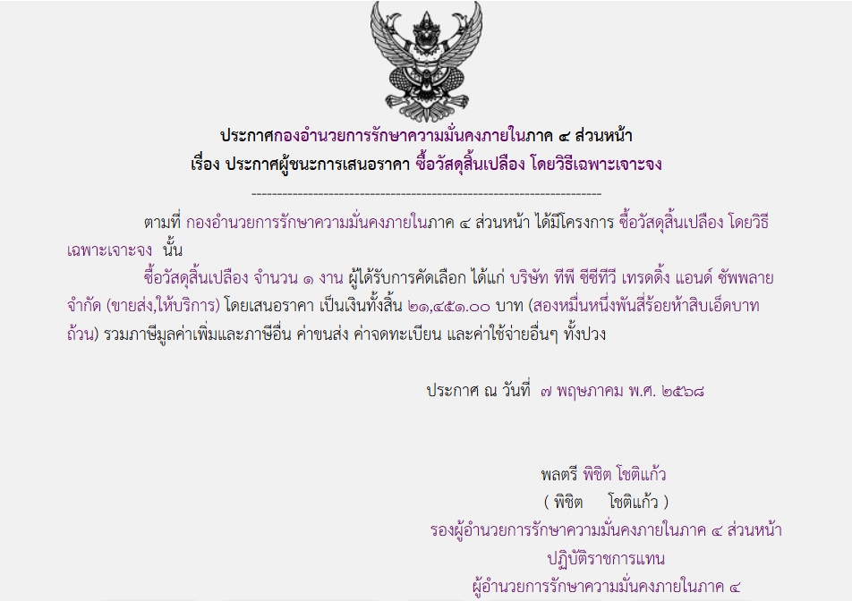 ประกาศผู้ชนะการเสนอราคา ขี้อวัสดุสิ้นเปลือง โดยวิธีเฉพาะเจาะจง