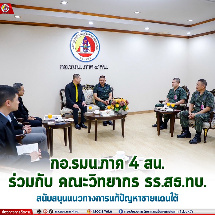 วันนี้ (29 พฤษภาคม 2568) เวลา 10.00 น. ณ ห้องรับรอง กองอำนวยการรักษาความมั่นคงภายในภาค 4 ส่วนหน้า ค่ายสิรินธร ตำบลเขาตูม อำเภอยะรัง จังหวัดปัตตานี พลโท ไพศาล หนูสังข์ แม่ทัพภาคที่ 4 / ผู้อำนวยการรักษาความมั่นคงภายในภาค 4 ให้การต้อนรับคณะวิทยากรจากโรงเรียนเสนาธิการทหารบก (รร.สธ.ทบ.) นำโดย พลตรี ดิษฐรัตน์ อมรวิทวัส ผู้บัญชาการโรงเรียนเสนาธิการทหารบก หัวหน้าคณะฯ ซึ่งเดินทางเข้าพบเพื่อรับฟังคำแนะนำและข้อเสนอแนะในการพัฒนาแนวทางการแก้ไขปัญหาจังหวัดชายแดนภาคใต้ (ARMY DESIGN METHODOLOGY – ADM) โดยมี พลตรี วรเดช เดชรักษา รองแม่ทัพภาคที่ 4 / รองผู้อำนวยการรักษาความมั่นคงภายในภาค 4 ส่วนหน้า ตลอดจนคณะผู้บังคับบัญชา กองอำนวยการรักษาความมั่นคงภายในภาค 4 ส่วนหน้า เข้าร่วม