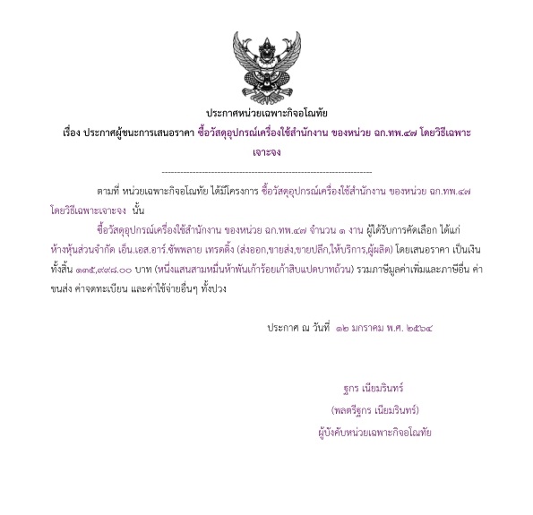 จัดซื้อ จัดจ้างประกาศผู้ชนะการเสนอราคา ประกาศผู้ชนะการเสนอราคา ซื้อวัสดุอุปกรณ์เครื่องใช้สำนักงาน ของหน่วย ฉก.ทพ.๔๗ โดยวิธีเฉพาะเจาะจง (135,998.00) January 13, 2021 903 Share Facebook Twitter Google+ Telegram LINE ฉก.อโณทัย