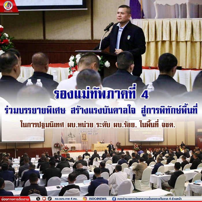 เมื่อวันที่ 29 พฤษภาคม 2568 เวลา 19.00 น. ที่ ห้องสมิหลา 1 โรงแรมบีพี สมิหลา บีช อำเภอเมือง จังหวัดสงขลา พลตรี วรเดช เดชรักษา รองแม่ทัพภาคที่ 4 / รองผู้อำนวยการรักษาความมั่นคงภายในภาค 4 ส่วนหน้า ร่วมบรรยายพิเศษ ถ่ายทอดประสบการณ์ในการปฏิบัติงานในพื้นที่จังหวัดชายแดนภาคใต้ เพื่อสร้างแรงบันดาลใจเสริมศักยภาพผู้นำหน่วย สู่การพิทักษ์พื้นที่และปกป้องพี่น้องประชาชน ในการปฐมนิเทศผู้บังคับหน่วย ระดับผู้บังคับกองร้อยในพื้นที่จังหวัดชายแดนภาคใต้ ประจำปี 2568 ภายใต้การขับเคลื่อนงานของกองอำนวยการรักษาความมั่นคงภายในภาค 4 ส่วนหน้า โดยมี ผู้บังคับหน่วย และผู้บังคับกองร้อย จากหน่วย ทหาร ตำรวจ และฝ่ายปกครอง ในพื้นที่ จังหวัดยะลา ปัตตานี นราธิวาส และสงขลา เข้าร่วมการอบรมและร่วมต้อนรับด้วยความอบอุ่น