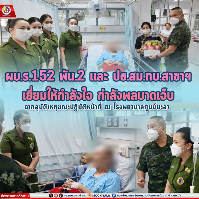 เมื่อวันที่ 29 พฤษภาคม 2568 เวลา 13.00 น. พันโท สว่างพงษ์ อบแพทย์ ผู้บังคับกองพันทหารราบที่ 2 กรมทหารราบที่ 152 พร้อมด้วย คุณพิชญ์สินี ลาภมหานนท์ ประธานสมาคมแม่บ้านทหารบก สาขากองพันทหารราบที่ 2 กรมทหารราบที่ 152 ได้นำกำลังพลและสมาชิกสมาคมฯ เดินทางไปยังโรงพยาบาลศูนย์ยะลา ตำบลสะเตง อำเภอเมือง จังหวัดยะลา เพื่อเยี่ยมให้กำลังใจ จ่าสิบเอก สุนทร อ่อนจ้อย กำลังพลในสังกัด ซึ่งได้รับบาดเจ็บจากอุบัติเหตุขณะปฏิบัติหน้าที่ภายในหน่วย เมื่อวันที่ 6 สิงหาคม 2567 ที่ผ่านมา