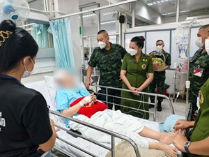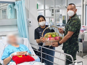 Commander of the 2nd Infantry Battalion, 152nd Infantry Regiment, and the President of the Army Wives Association (Battalion Branch) visit and offer encouragement to an injured soldier at Yala Regional Hospital.