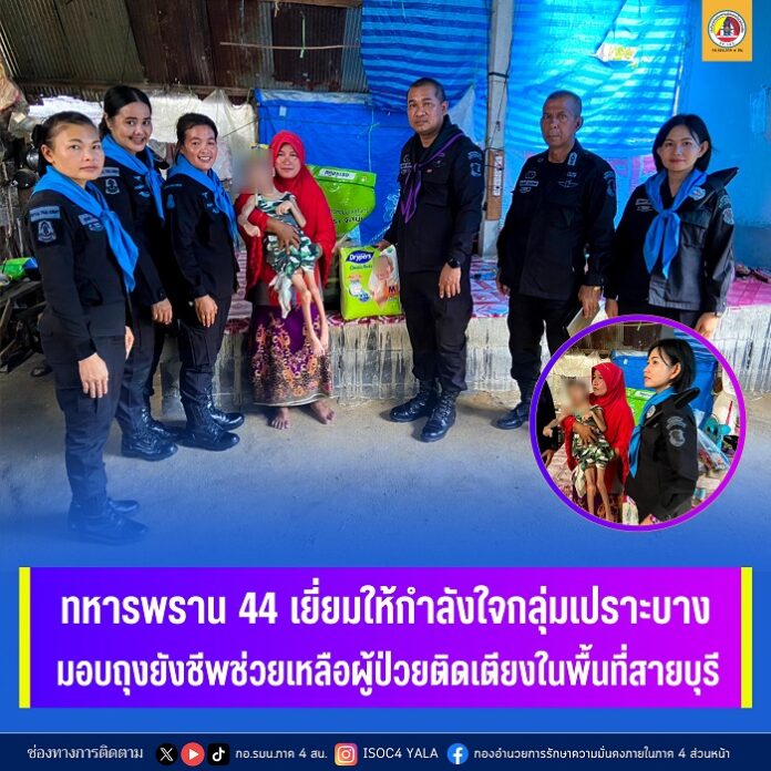 เมื่อวันที่ 30 พฤษภาคม 2568 เวลา 17.00 น. พันเอก ณัฐวุฒิ ศรีสังข์ ผู้บังคับหน่วยเฉพาะกิจกรมทหารพรานที่ 44 พร้อมหมวดทหารพรานหญิง ลงพื้นที่เยี่ยมเยียนและให้กำลังใจครอบครัวของนางสาวอายเสาะ ดือรามะ ในพื้นที่ตำบลปะเสยะวอ อำเภอสายบุรี จังหวัดปัตตานี ซึ่งมีบุตรชาย คือ เด็กชายอาสุวรรณ นาแว ผู้ป่วยติดเตียงจากภาวะกล้ามเนื้ออ่อนแรง การพบปะครั้งนี้เพื่อสอบถามความเป็นอยู่ ความต้องการ และข้อขัดข้องในการดำเนินชีวิต เพื่อพิจารณาแนวทางให้ความช่วยเหลืออย่างเหมาะสมในโอกาสต่อไป