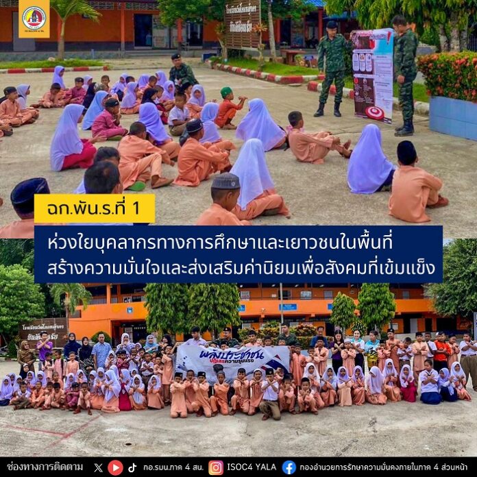 เมื่อวันที่ 30 พฤษภาคม 2568 หน่วยเฉพาะกิจ กองพันทหารราบที่ 1 (ฉก.พัน.ร.ที่ 1) ได้จัดกำลังพลจาก “ชุดปฏิบัติการเสริมสร้างความเข้าใจ” ลงพื้นที่พบปะพูดคุยและพัฒนาความสัมพันธ์กับบุคลากรทางการศึกษา ณ โรงเรียนวัดโคกหญ้าคา หมู่ที่ 6 บ้านโคกหญ้าคา ตำบลคลองใหม่ อำเภอยะรัง จังหวัดปัตตานี ซึ่งอยู่ในความรับผิดชอบของหน่วย โดยมุ่งเน้นการสร้างค่านิยมให้แก่เยาวชนและนักเรียนเกี่ยวกับอุดมการณ์ “รักชาติ ศาสนา และพระมหากษัตริย์” พร้อมทั้งประชาสัมพันธ์ให้ความรู้เกี่ยวกับภัยแทรกซ้อนที่อาจเกิดขึ้นในชุมชน โดยเฉพาะเรื่องสารเสพติดในรูปแบบต่าง ๆ โดยได้รับการตอบรับอย่างอบอุ่นจากครู นักเรียน และชาวบ้านในพื้นที่